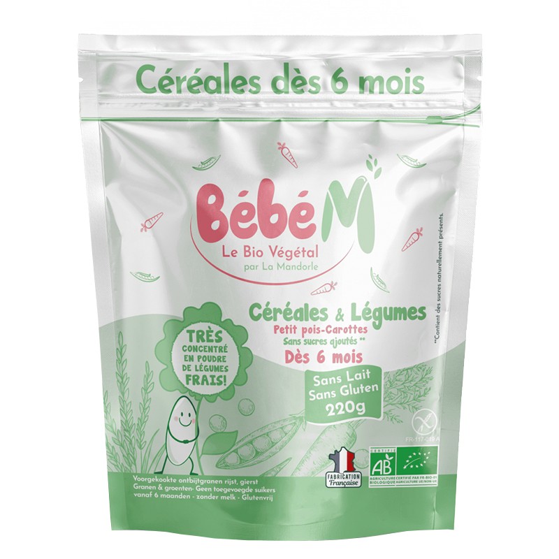 7,57 € (14.81 лв.)Bébé M Зърнена каша с грах и морков, БИО – За бебета 6+ месеца, 220 g